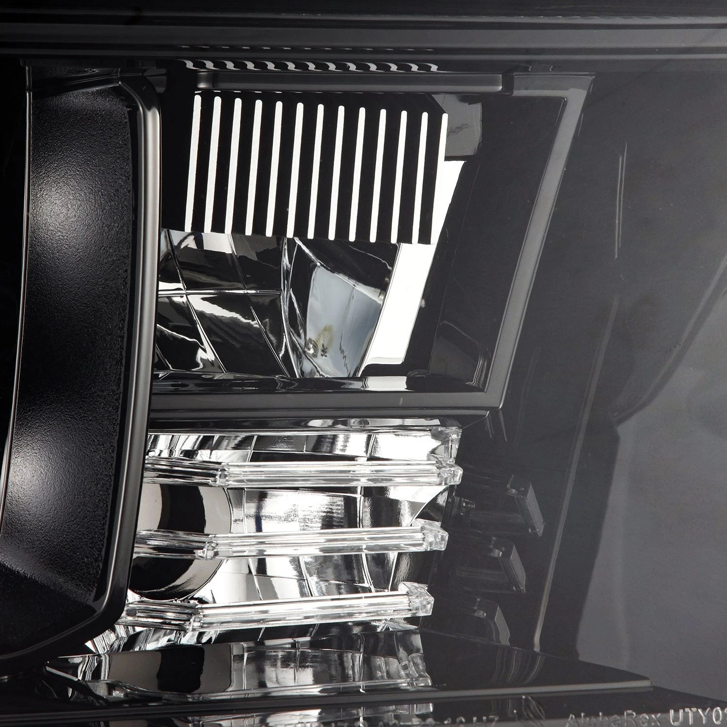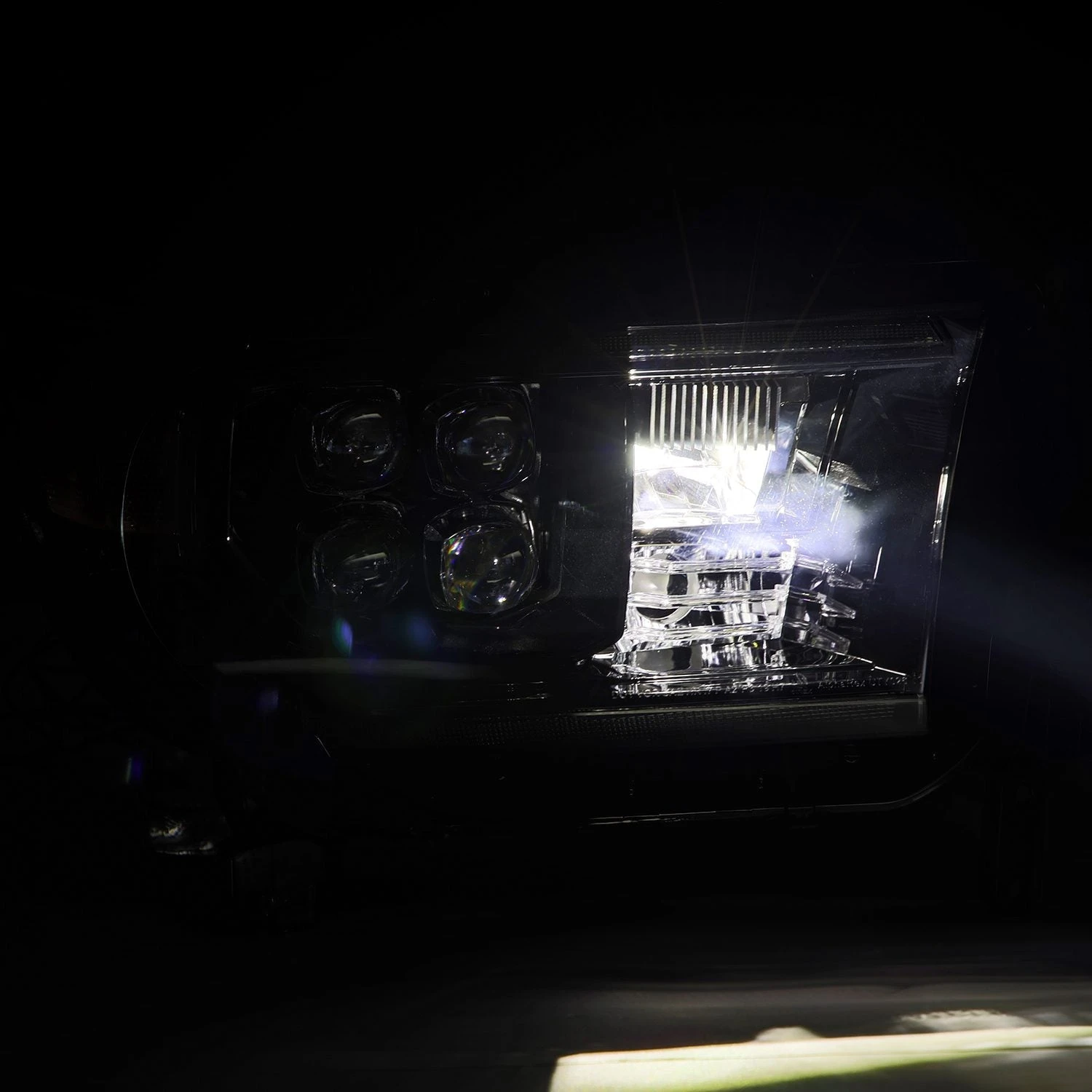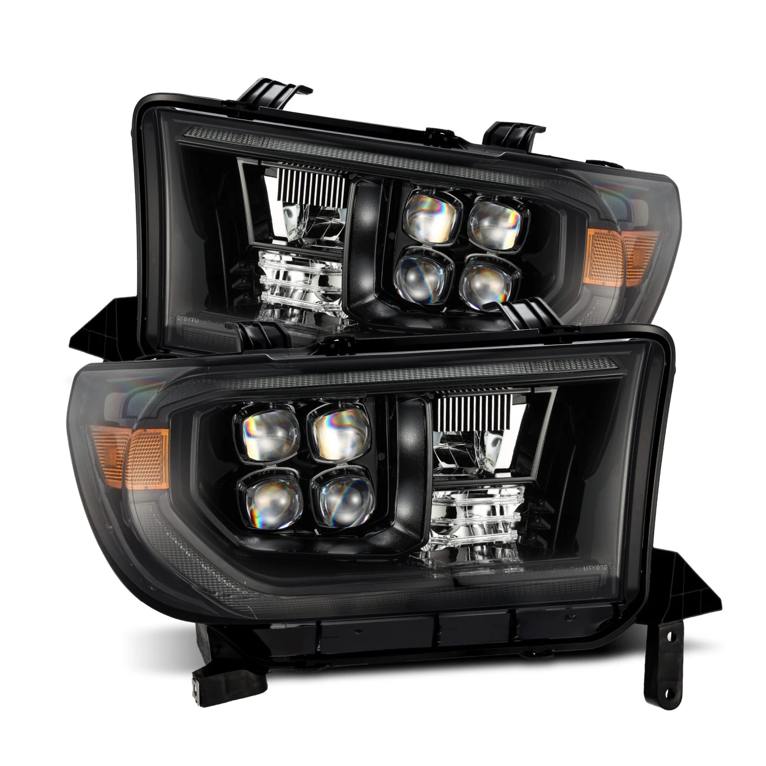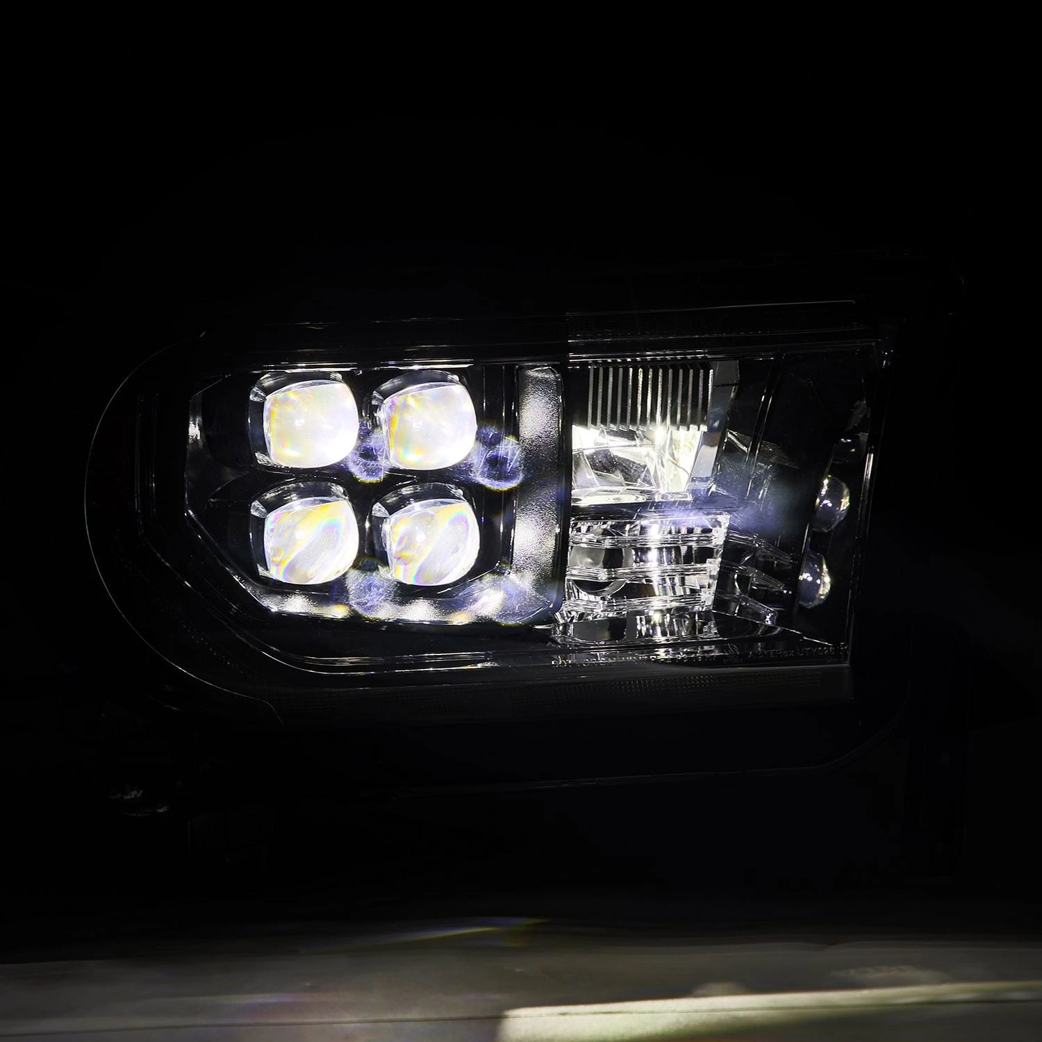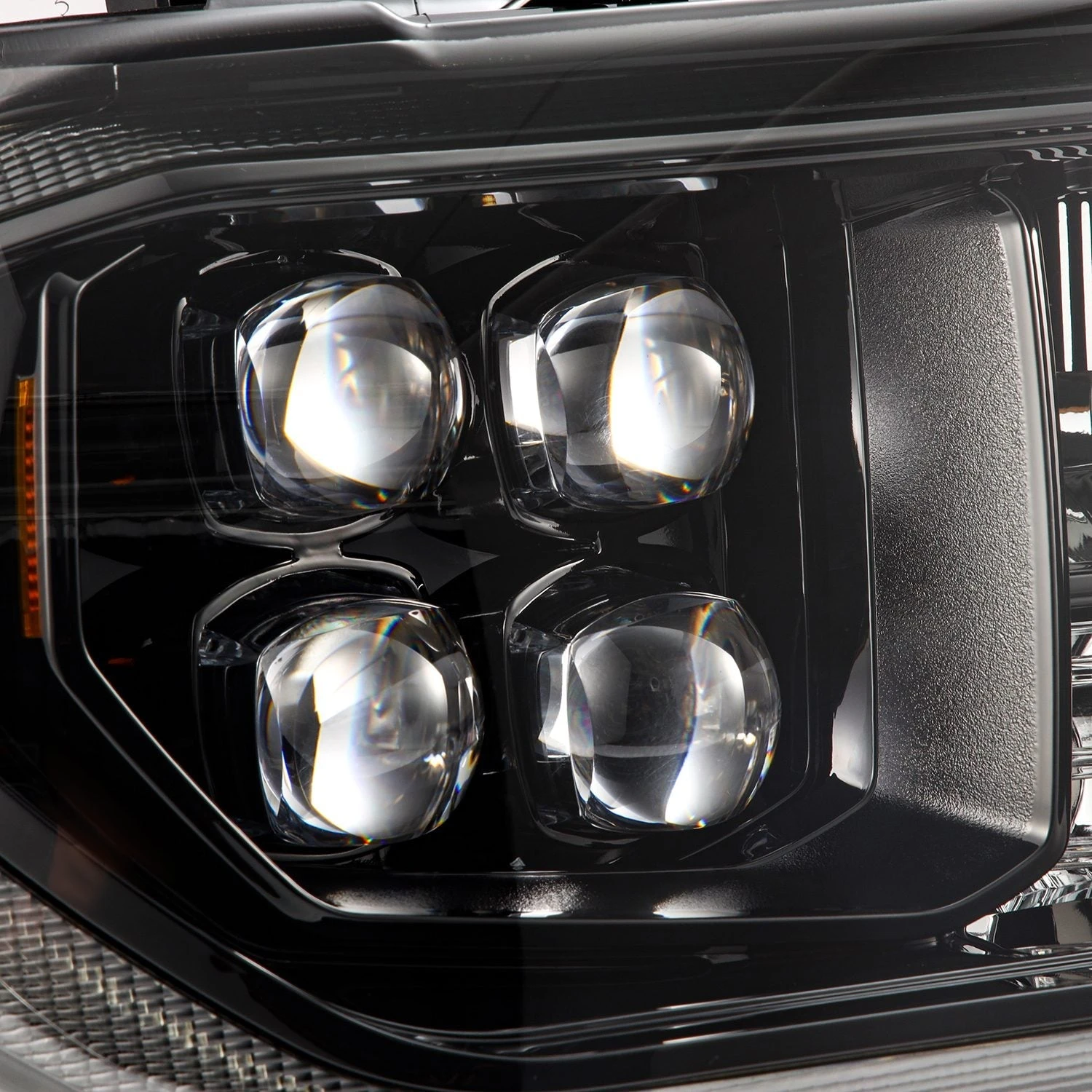 Positioned at the side of the headlights, the amber reflector lens enhances visibility and safety, complemented by an amber halogen bulb at the bottom for turn signal functionality. Embracing a quad projector design, our 2nd gen Toyota Tundra/Sequoia NOVA-series headlights ensure optimal illumination, with four projectors lighting up for low beam and a built-in LED at the center delivering powerful high beam output.