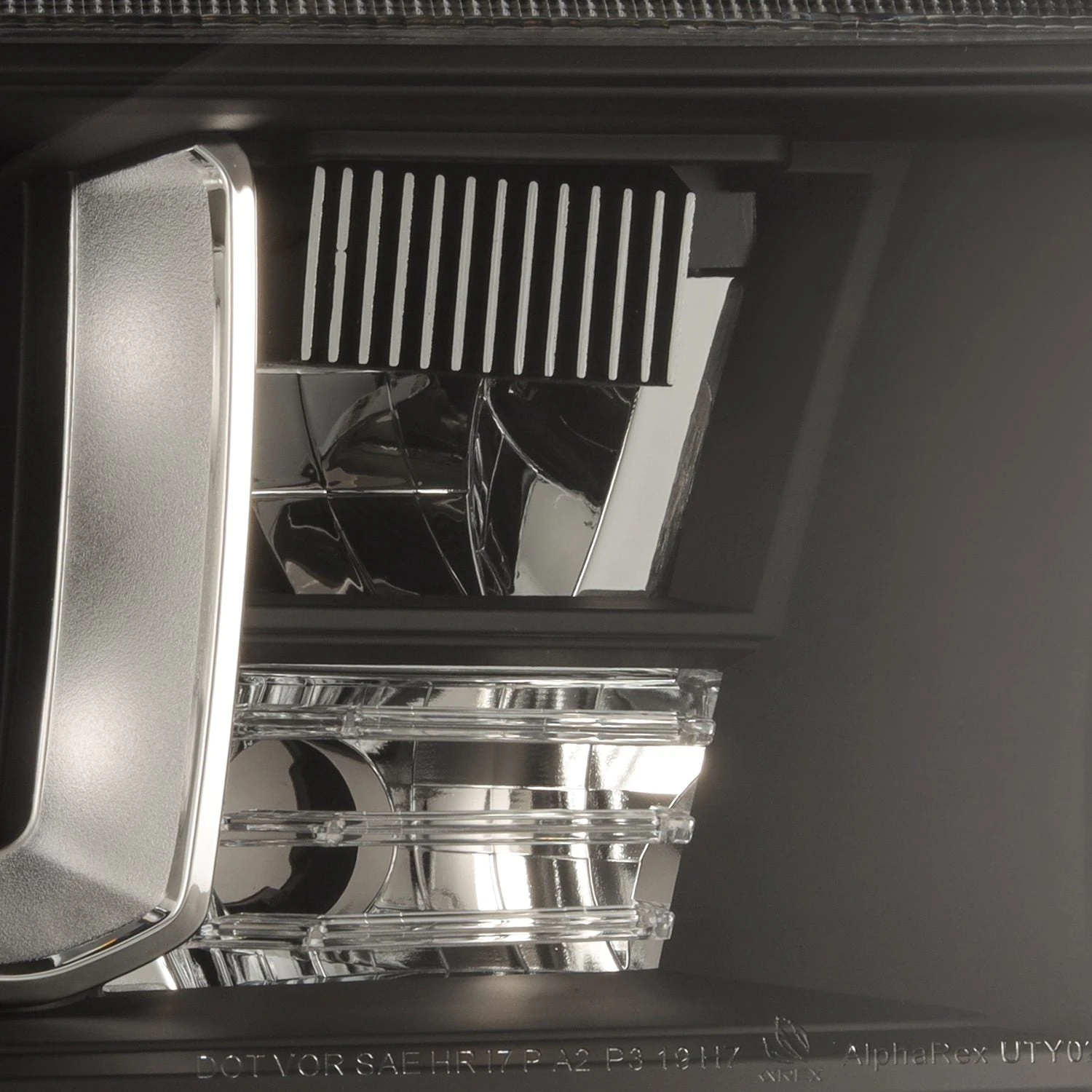Positioned at the side of the headlights, the amber reflector lens enhances visibility and safety, complemented by an amber halogen bulb at the bottom for turn signal functionality. Embracing a quad projector design, our 2nd gen Toyota Tundra/Sequoia NOVA-series headlights ensure optimal illumination, with four projectors lighting up for low beam and a built-in LED at the center delivering powerful high beam output.