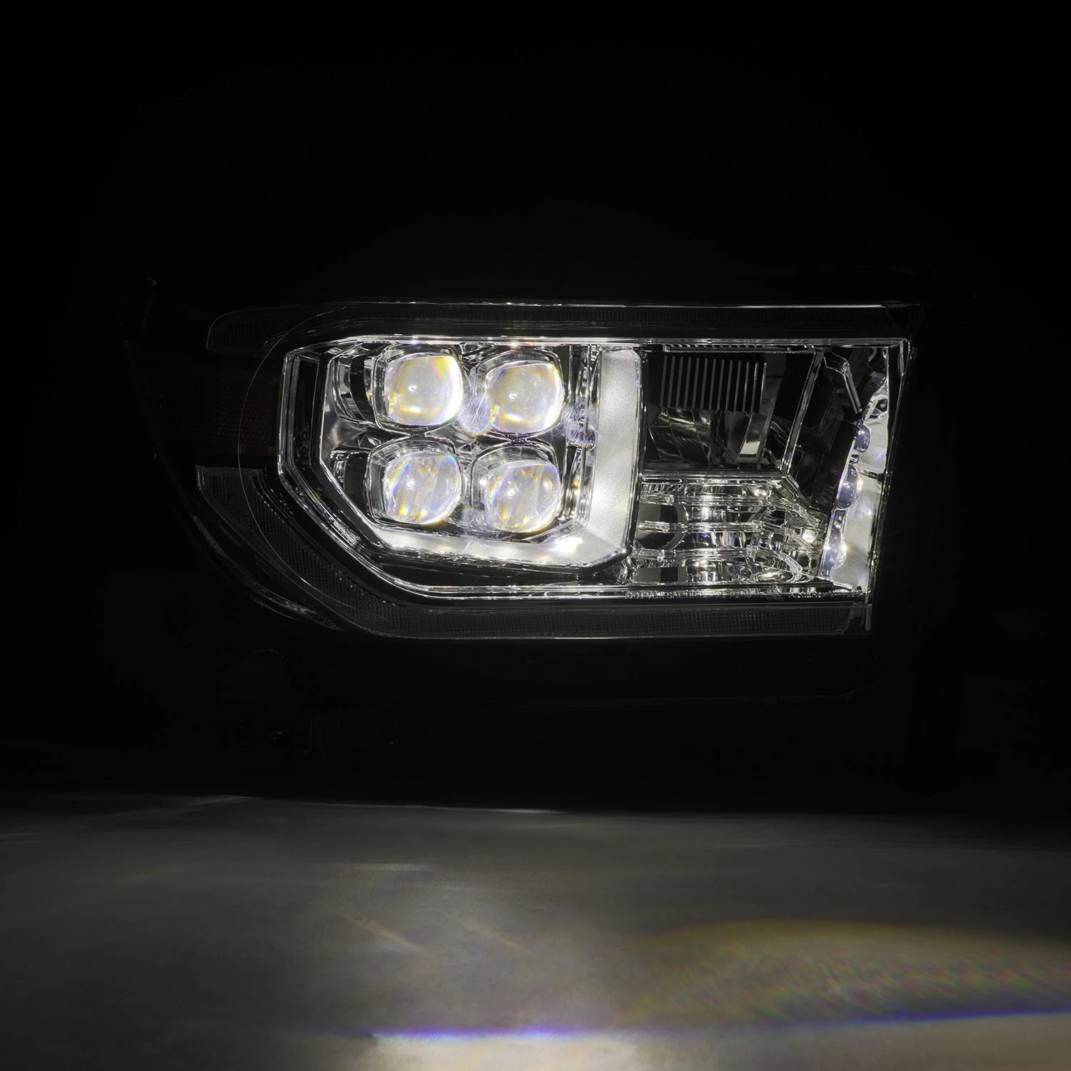 Positioned at the side of the headlights, the amber reflector lens enhances visibility and safety, complemented by an amber halogen bulb at the bottom for turn signal functionality. Embracing a quad projector design, our 2nd gen Toyota Tundra/Sequoia NOVA-series headlights ensure optimal illumination, with four projectors lighting up for low beam and a built-in LED at the center delivering powerful high beam output.