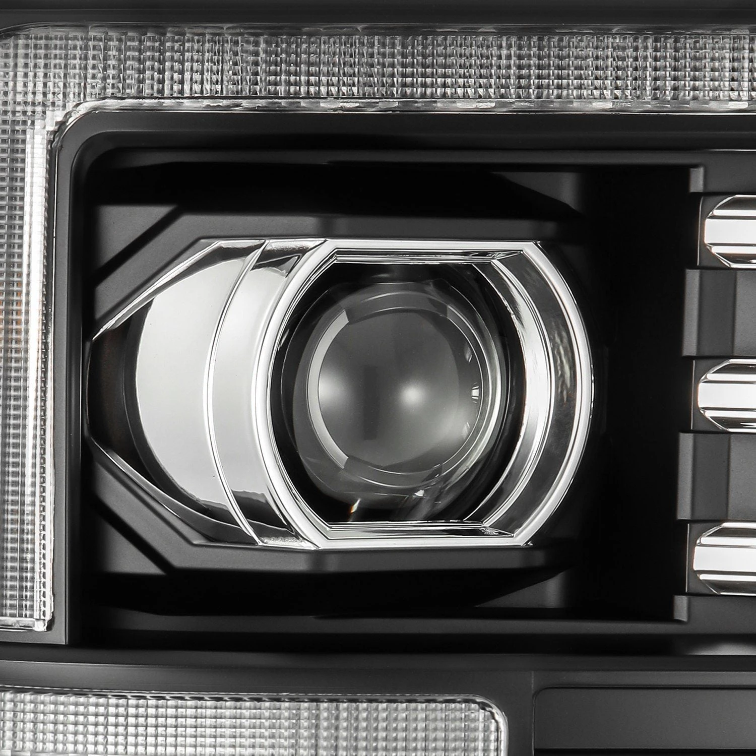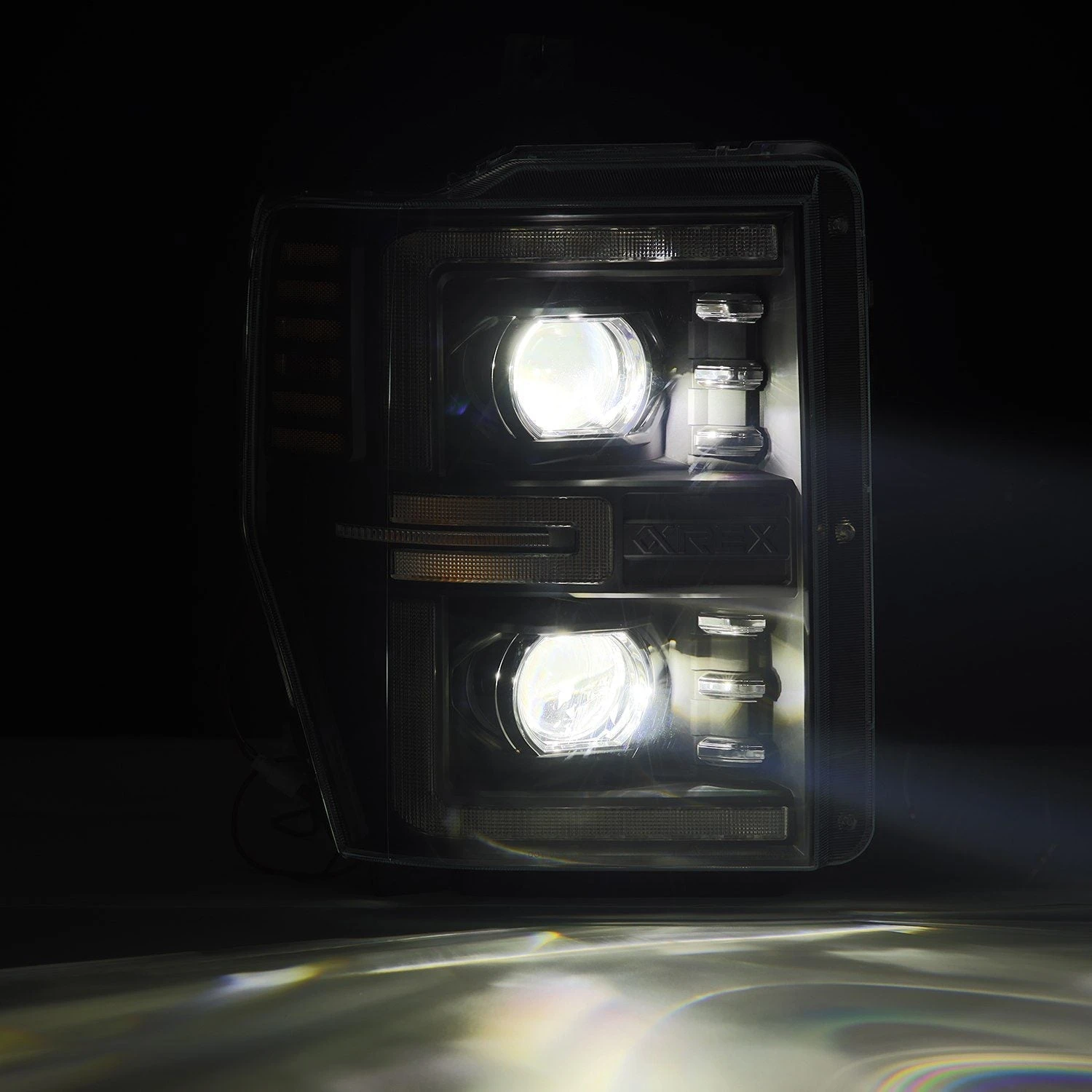 For the 2nd gen Ford Super Duty LUXX-series projector headlights, we drew inspiration from the 4th gen Super Duty aesthetics, adapting them seamlessly to the 2nd gen Super Duty model. A switchback LED light tube surrounds the headlights, serving as both a DRL and sequential turn signal for enhanced visibility and style.
