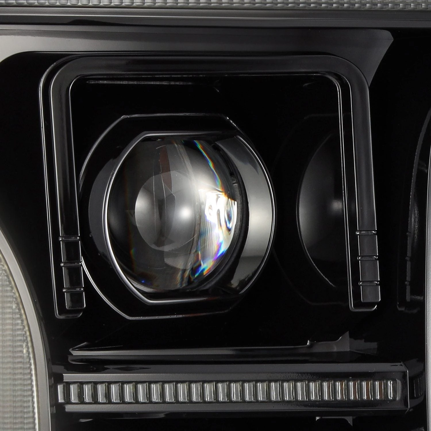 For our 13th gen Ford F-150 MKII PRO-Series projector headlights, we’ve incorporated dual projectors alongside the iconic 14th gen F150 look LED bar surrounding the light, which functions as both a DRL and signal light. These 13th gen Ford F-150 MKII PRO-Series projector headlights feature switchback white LED DRL and amber LED sequential turn signal lights for enhanced visibility and style. Positioned at the center is our distinctive claw signature amber lens signal light, adding a unique touch to the design. The top projector is dedicated to low beam functionality, while the bottom projector provides high beam illumination. To ensure reliable performance, the headlights utilize H7 halogen bulbs for both low and high beam operations.