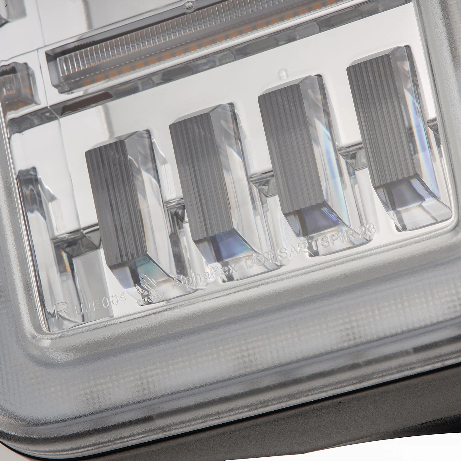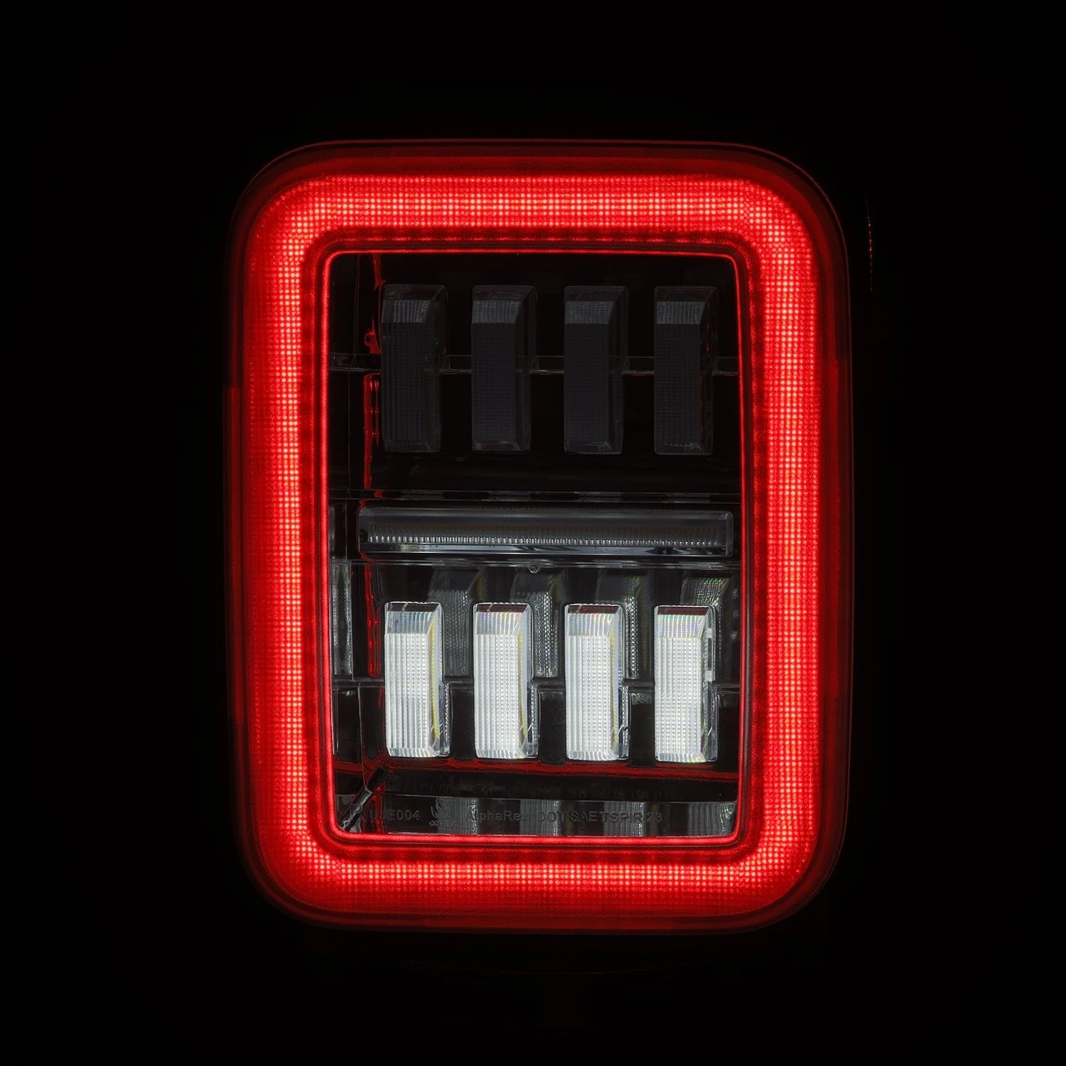 Introducing the Jeep Gladiator JT NOVA-series Prismatic LED tail lights, our pioneering entry into NOVA-Series Prismatic tail lights with prism optics technology. These Jeep Gladiator JT NOVA-series Prismatic LED tail lights showcase 8 trapezoidal prisms. The top 4 prisms utilize red LEDs for braking, while the bottom 4 prisms combine red brake LEDs with white reverse LEDs for enhanced visibility. Nestled between these prisms is a diffuser lens light tube, emitting an amber LED sequential turn signal. A standout LED tube surrounds the tail lights, creating a 3D effect and illuminating as a parking light. Unique to AlphaRex, these Jeep Gladiator JT NOVA-series Prismatic LED tail lights feature our signature activation light sequence when the parking lights are turned on, adding a distinctive touch to your Gladiator JT. Upgrade to our Jeep Gladiator JT NOVA-series Prismatic LED tail lights for a blend of sophistication and functionality.